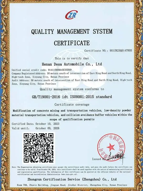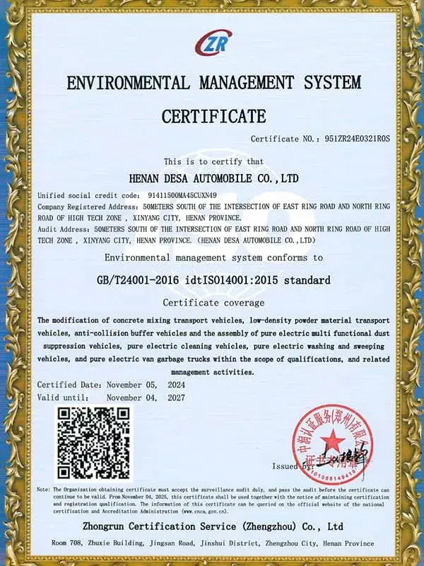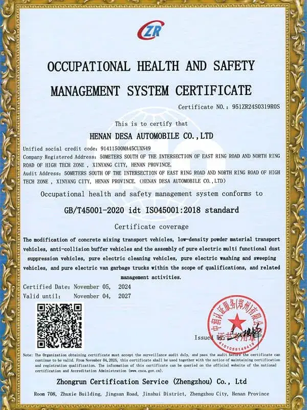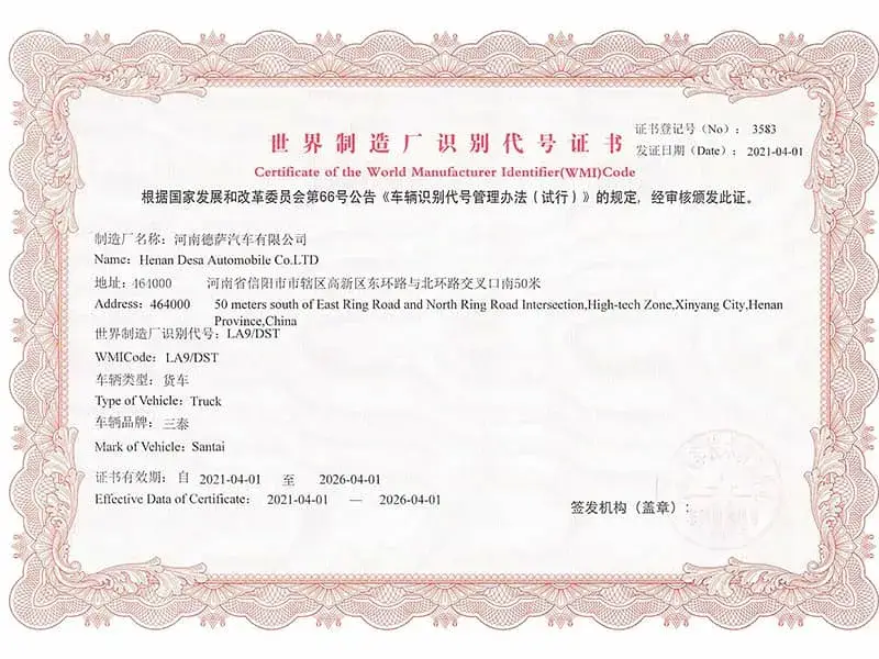 Titulaire d’une licence officielle de fabrication de véhicules spécialisés délivrée par le Ministère chinois de l’Industrie et des Technologies de l’Information (MIIT) et dotée d’un capital social de 50 millions de RMB, DESA conçoit des véhicules pensés pour répondre aux exigences actuelles tout en anticipant les opportunités de demain. Contactez-nous pour discuter de vos besoins et découvrir comment nos solutions peuvent soutenir durablement vos projets.