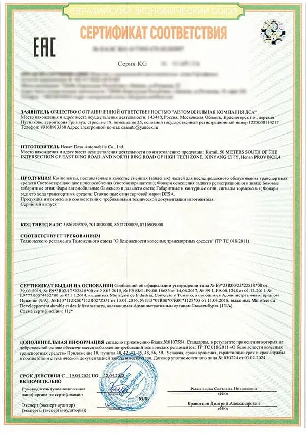 Certificat de kit véhicule KD (partie éclairage) – EAC
