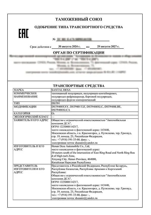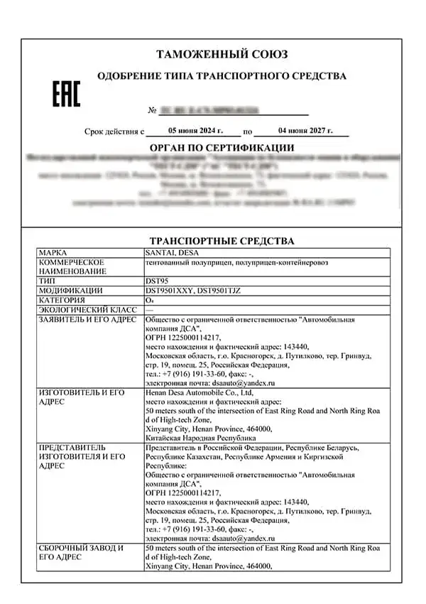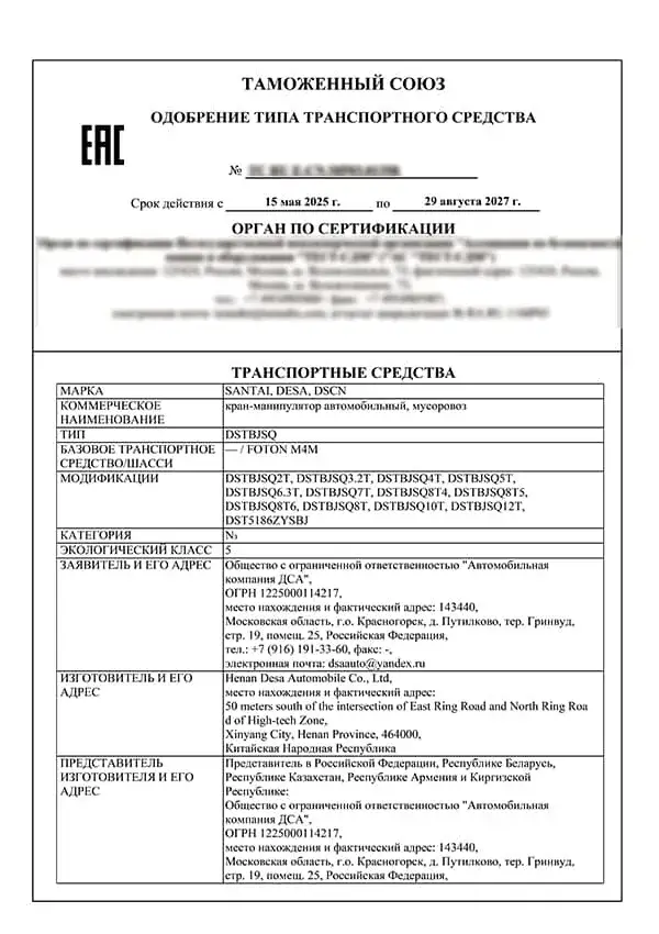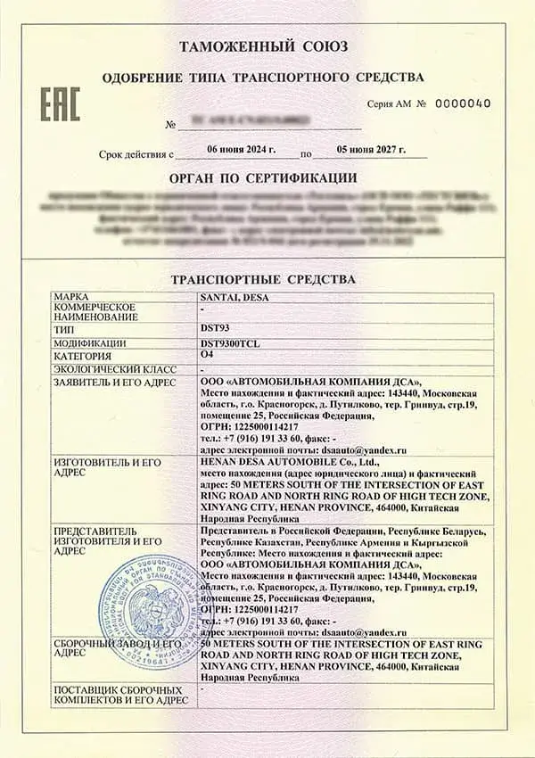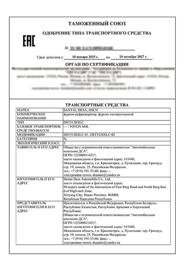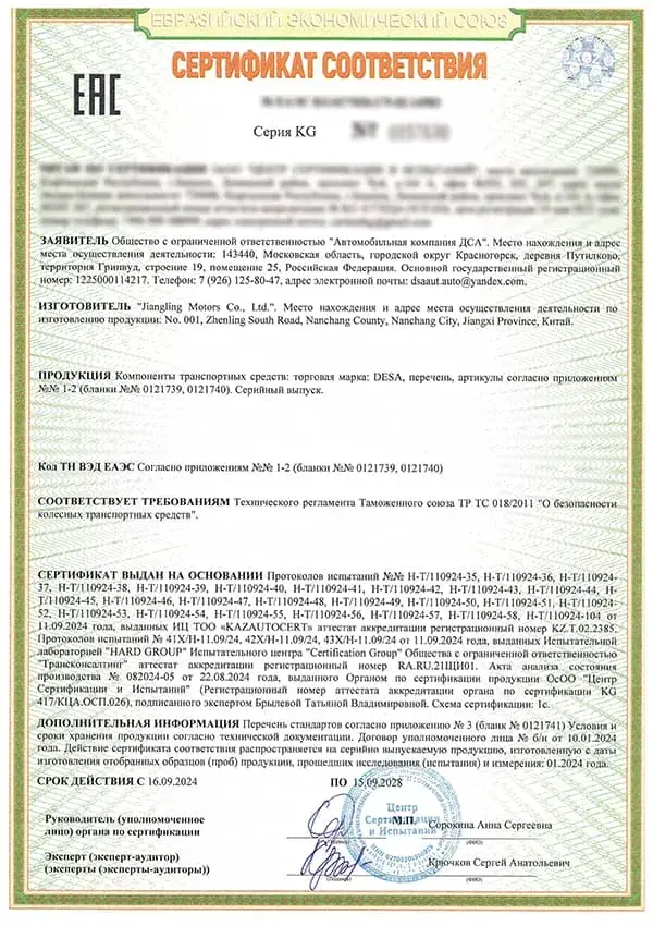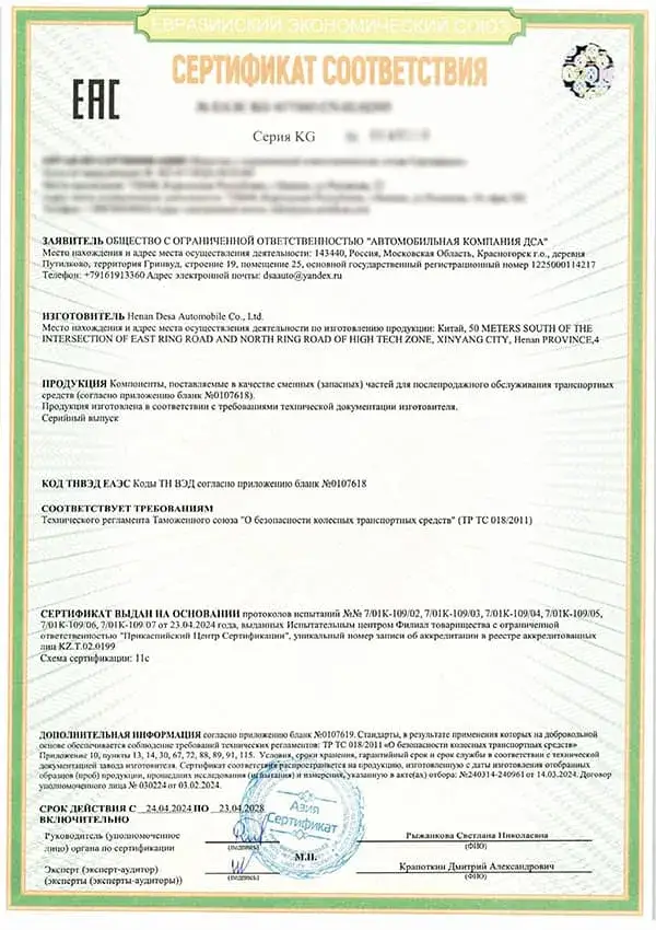 Certificat de kit véhicule KD (partie châssis) – EAC