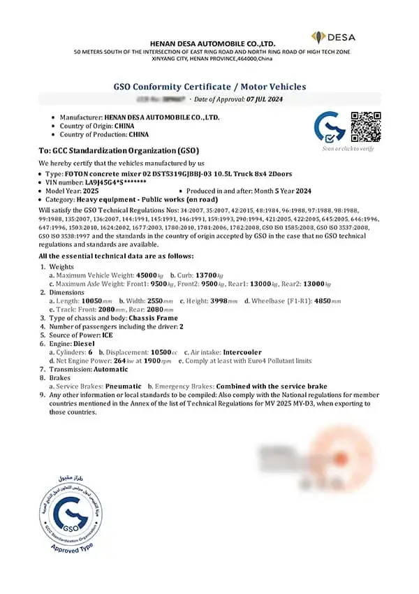 Certificat de camion malaxeur Foton Cummins 8 500 cm³ – GCC